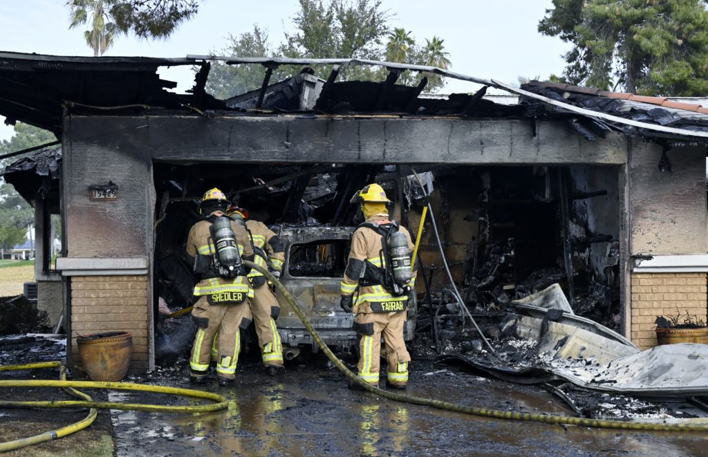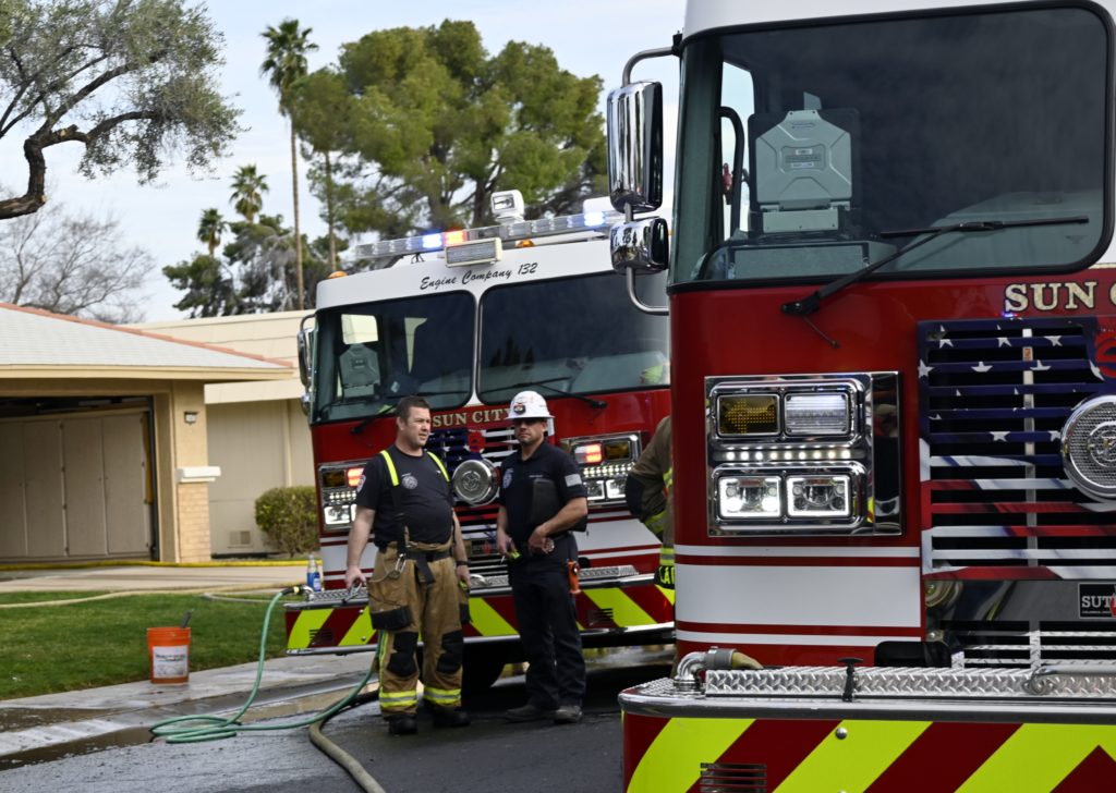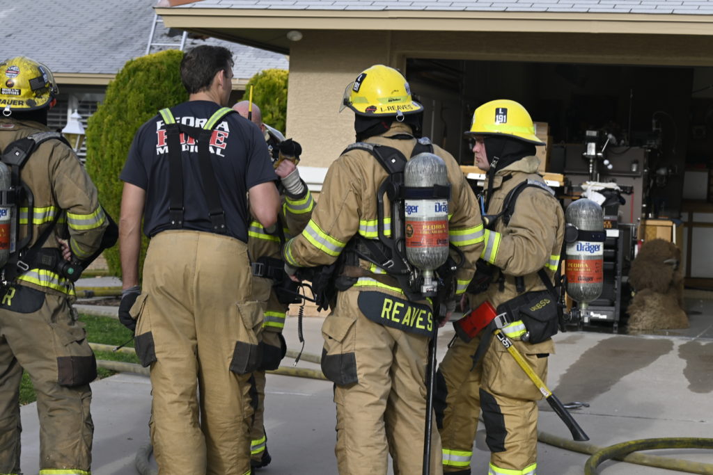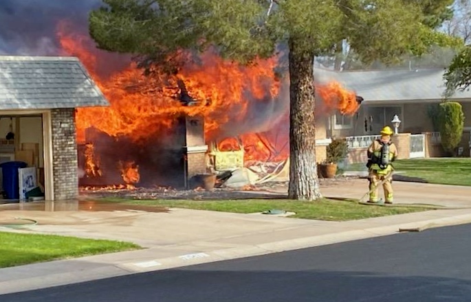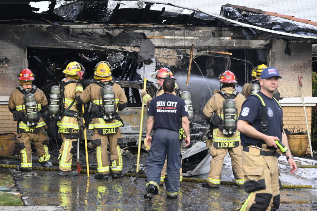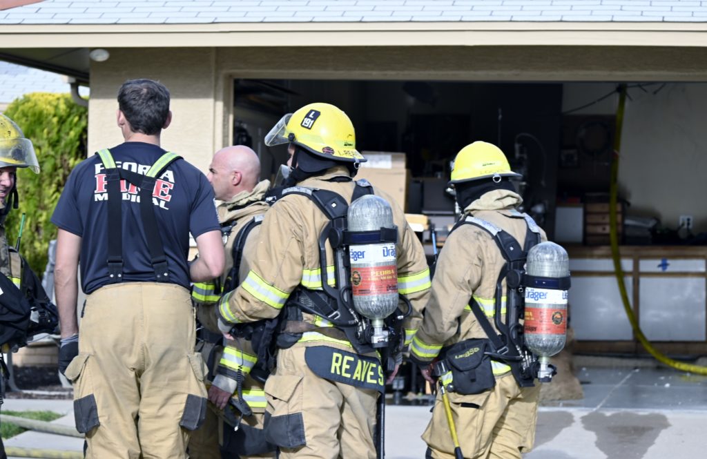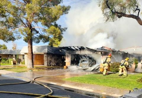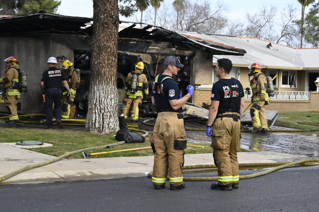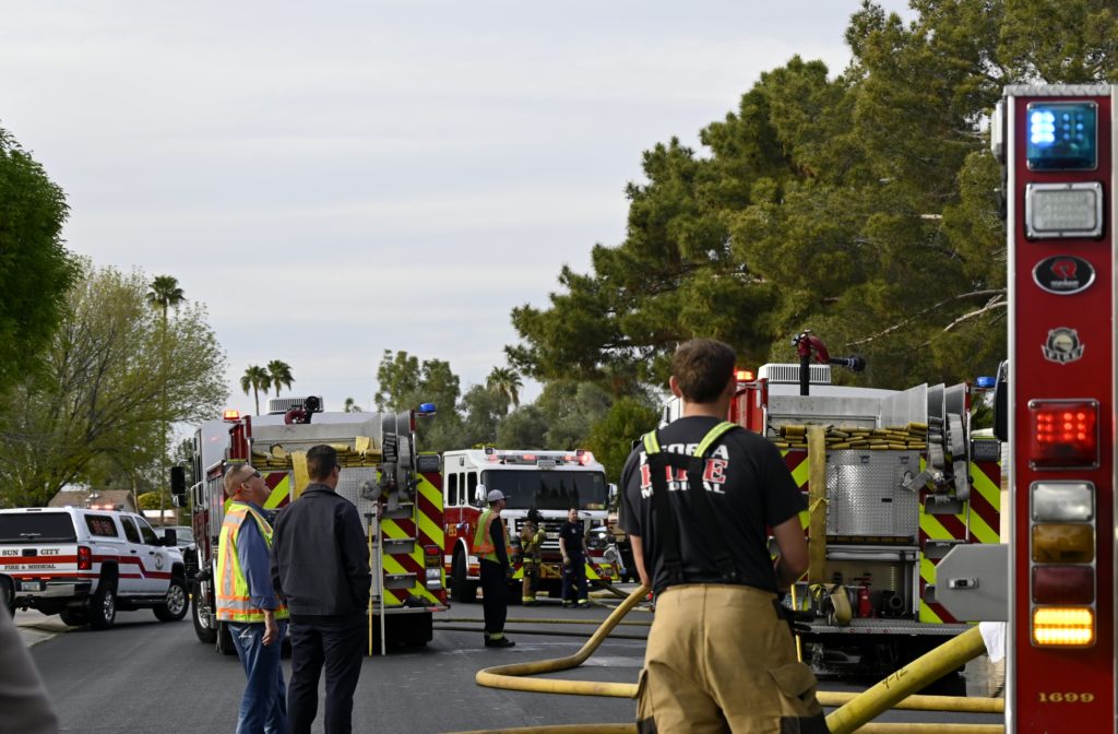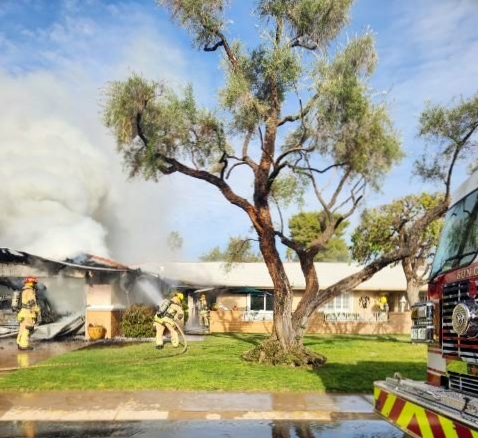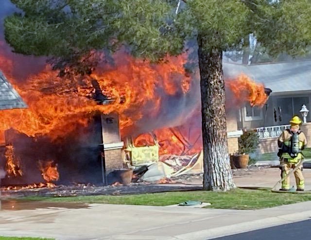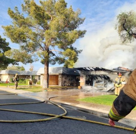 3/06/23 WF Suncity One Story Duplex Fire In One Garage With Heavy Ext Into The Unit The Attic And Thur The Roof Ext Into A Exp Garage Units When Defensive For A While The Units Did A Great Job Keeping It Out Of The Other Duplex Suncity & Peoria Glendale Working Cameo Dr Sandstone Dr