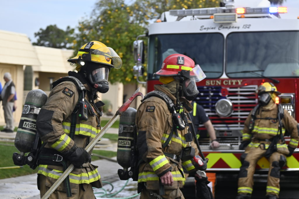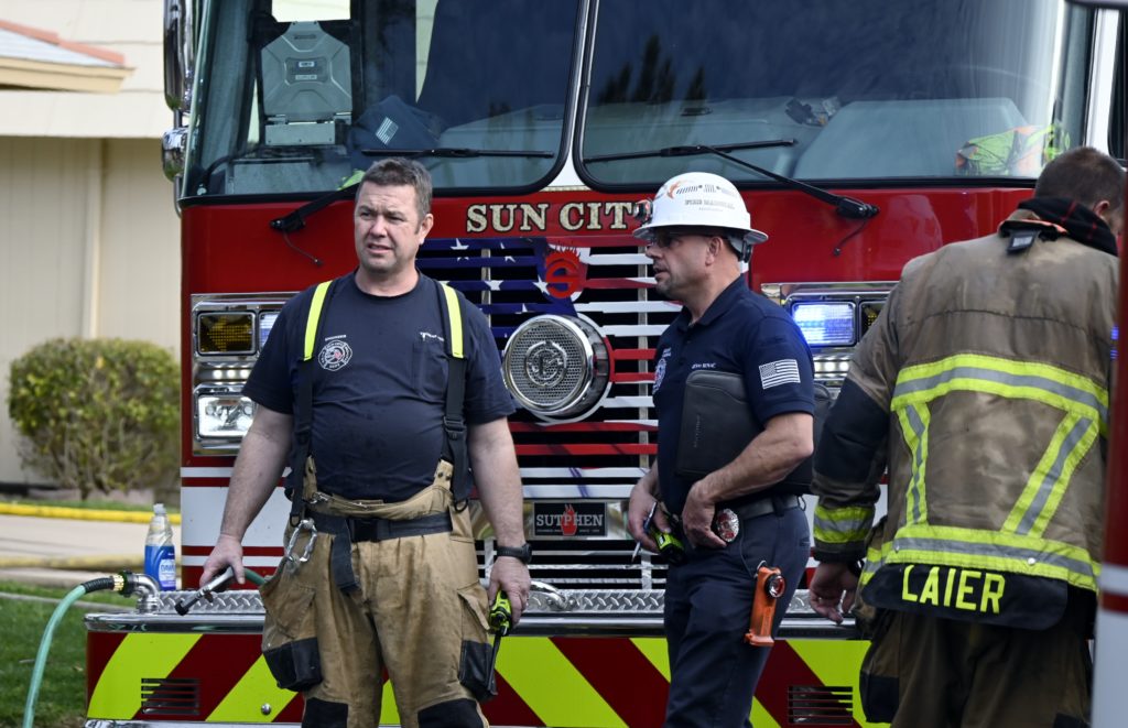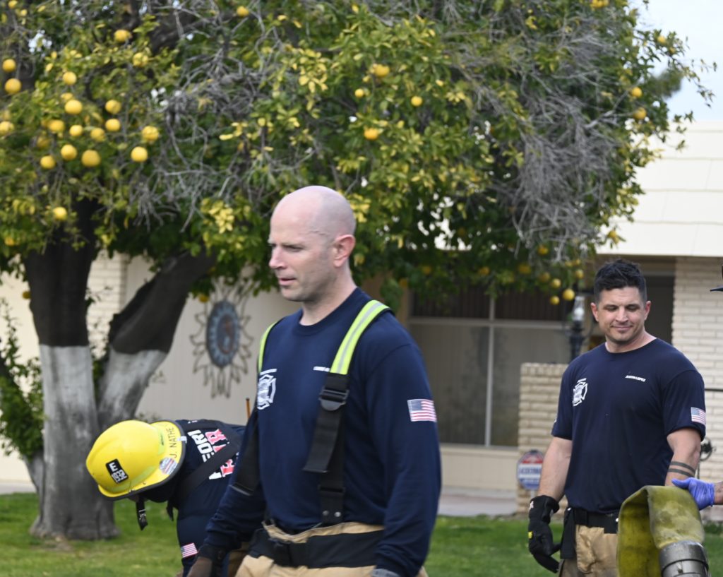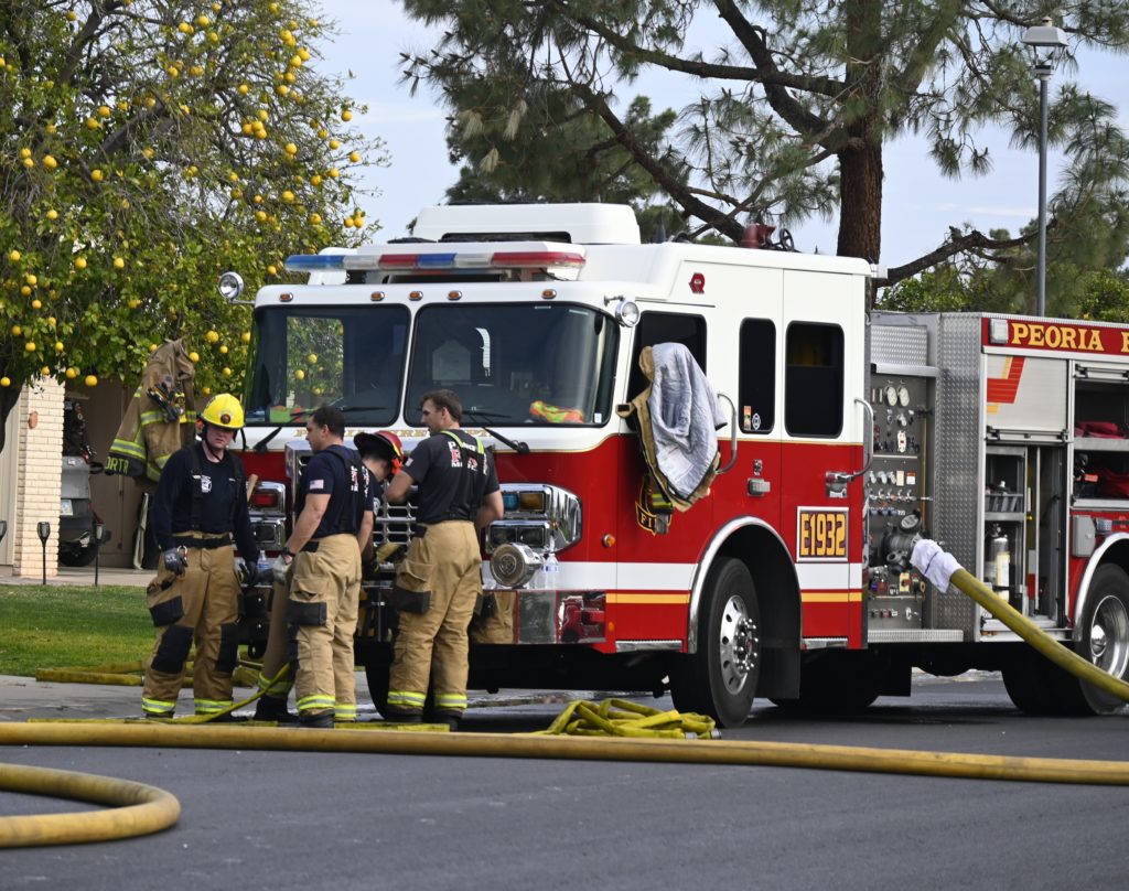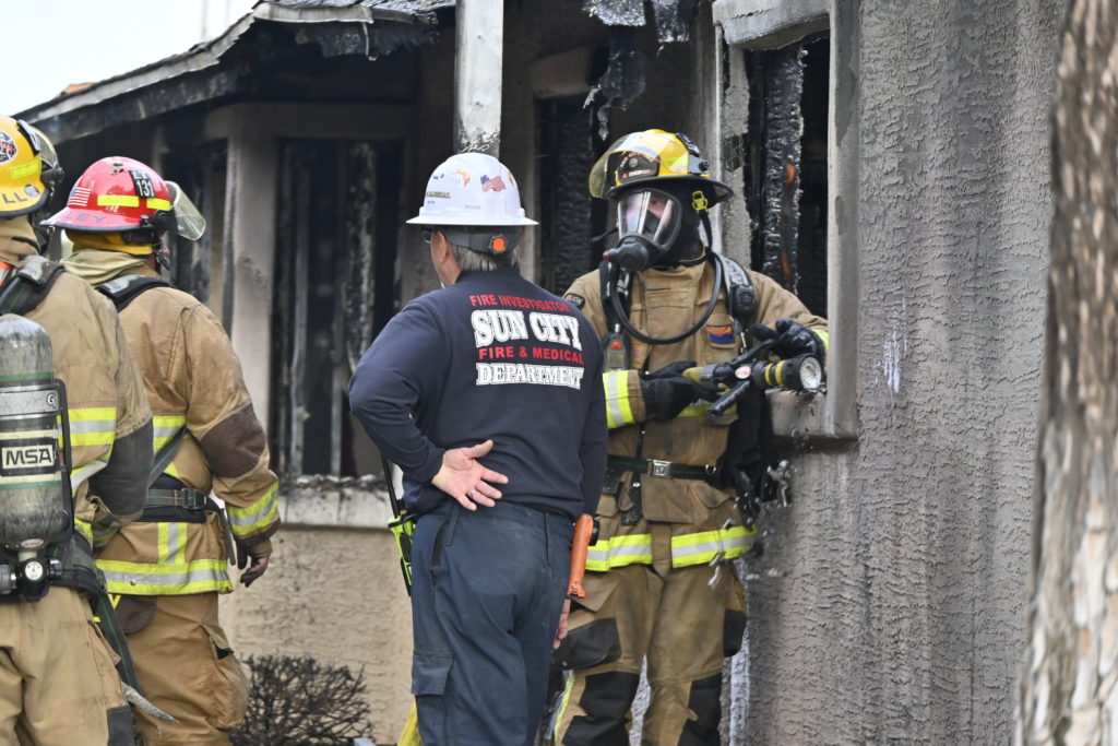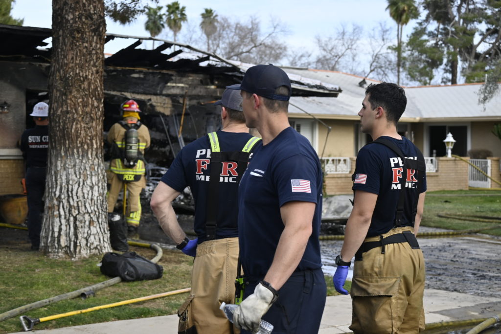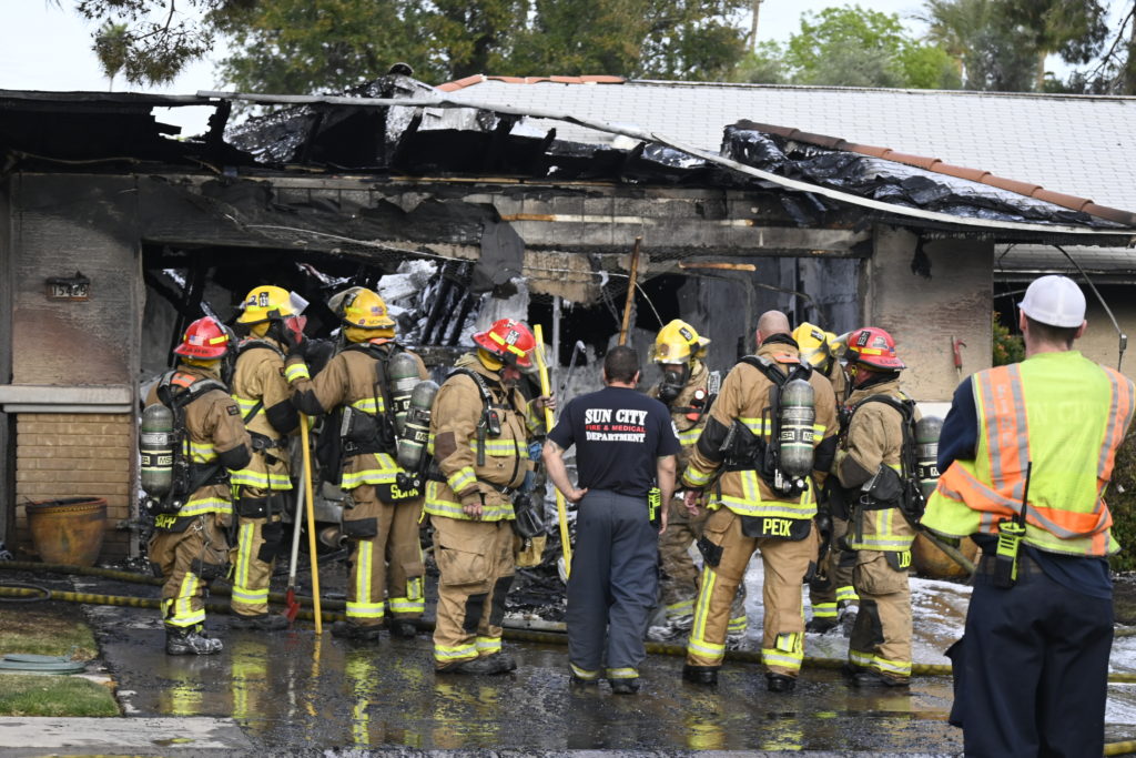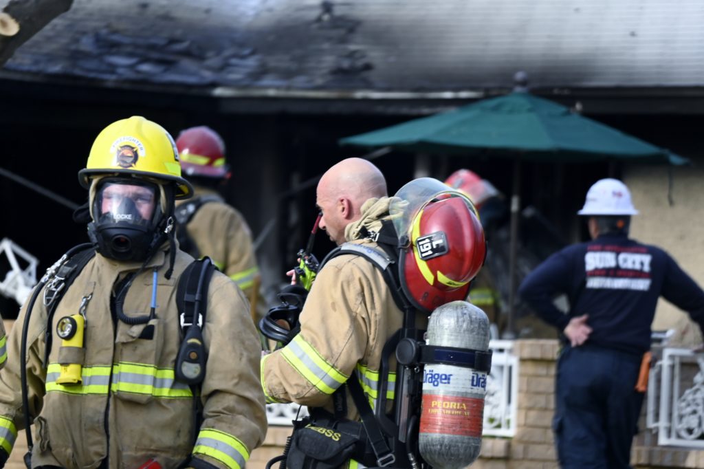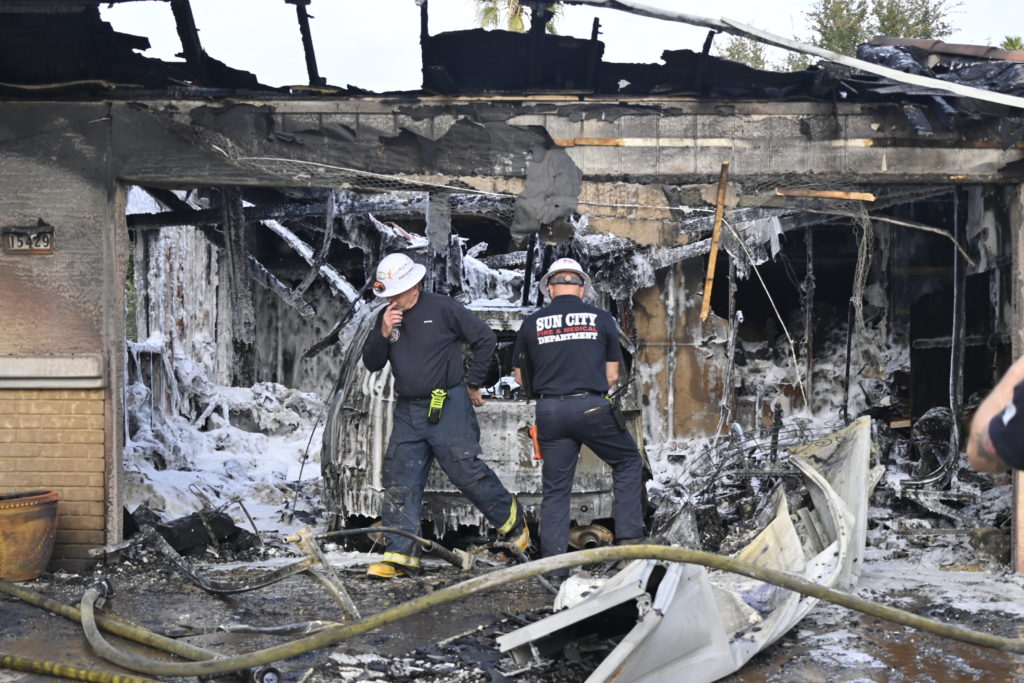 3/06/23 WF Suncity One Story Duplex Fire In One Garage With Heavy Ext Into The Unit The Attic And Thur The Roof Ext Into A Exp Garage Units When Defensive For A While The Units Did A Great Job Keeping It Out Of The Other Duplex Suncity & Peoria Glendale Working Cameo Dr Sandstone Dr