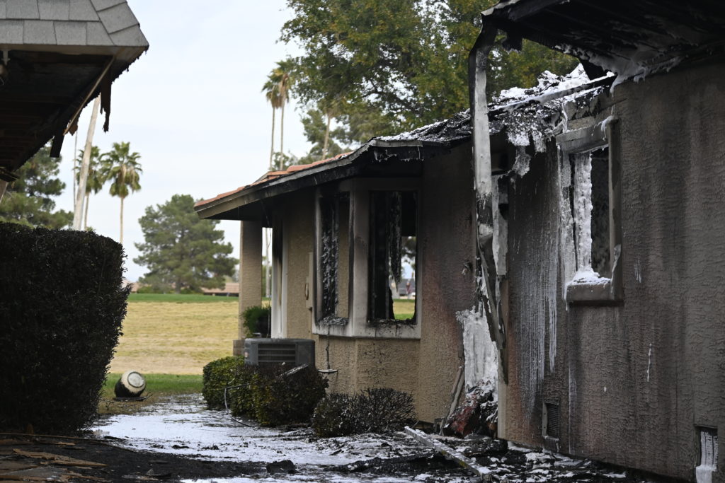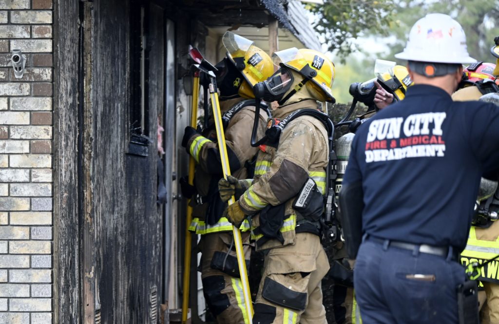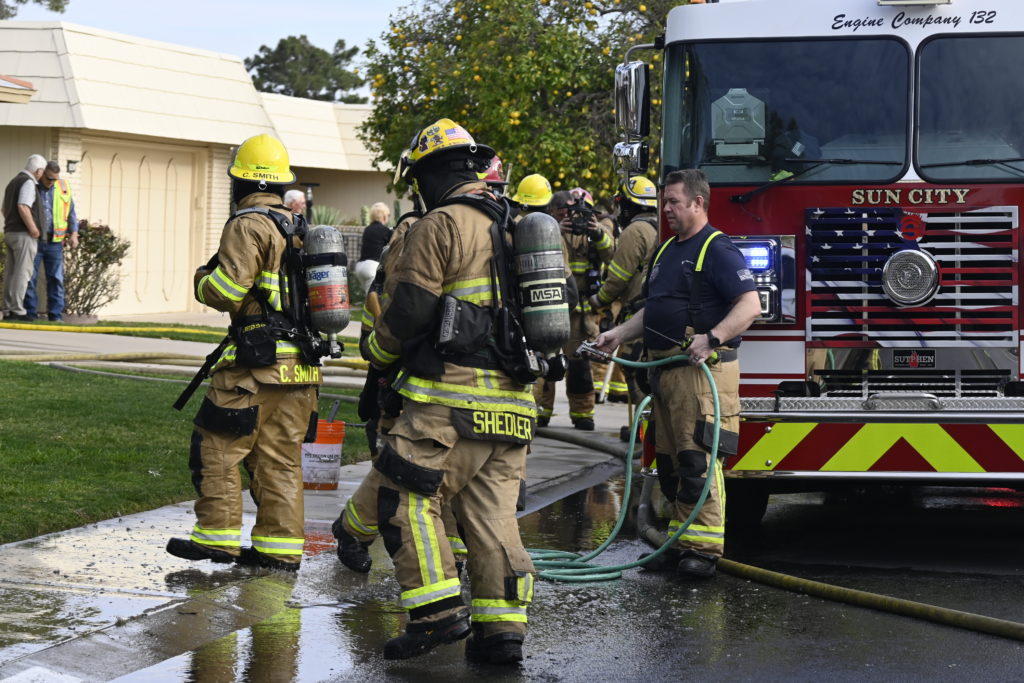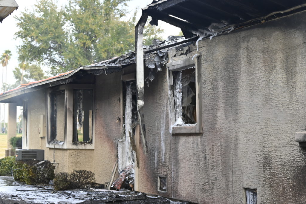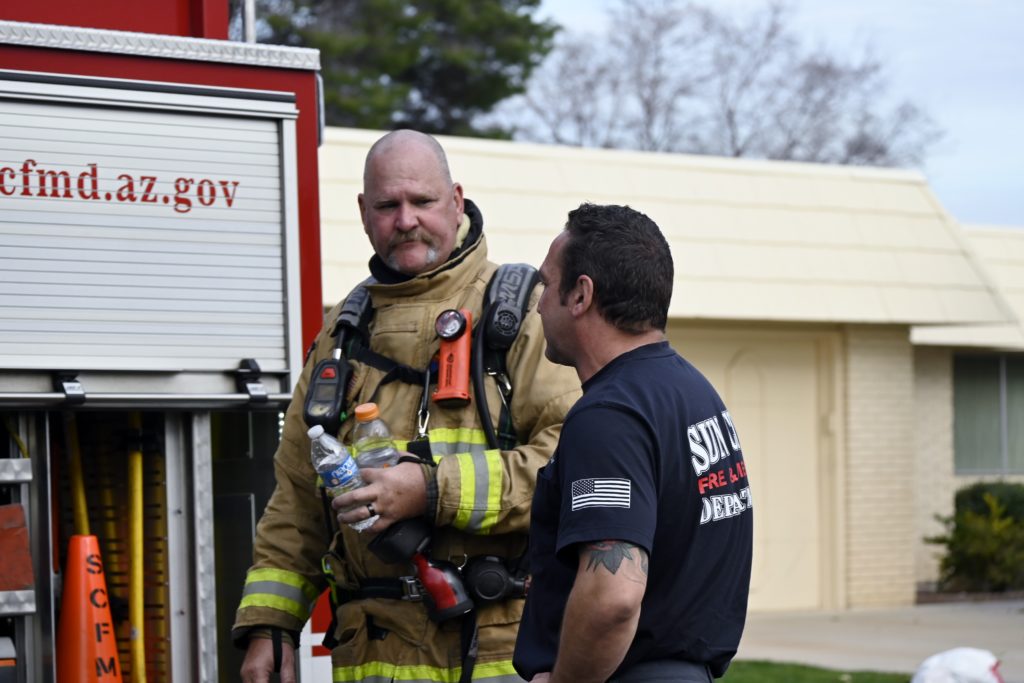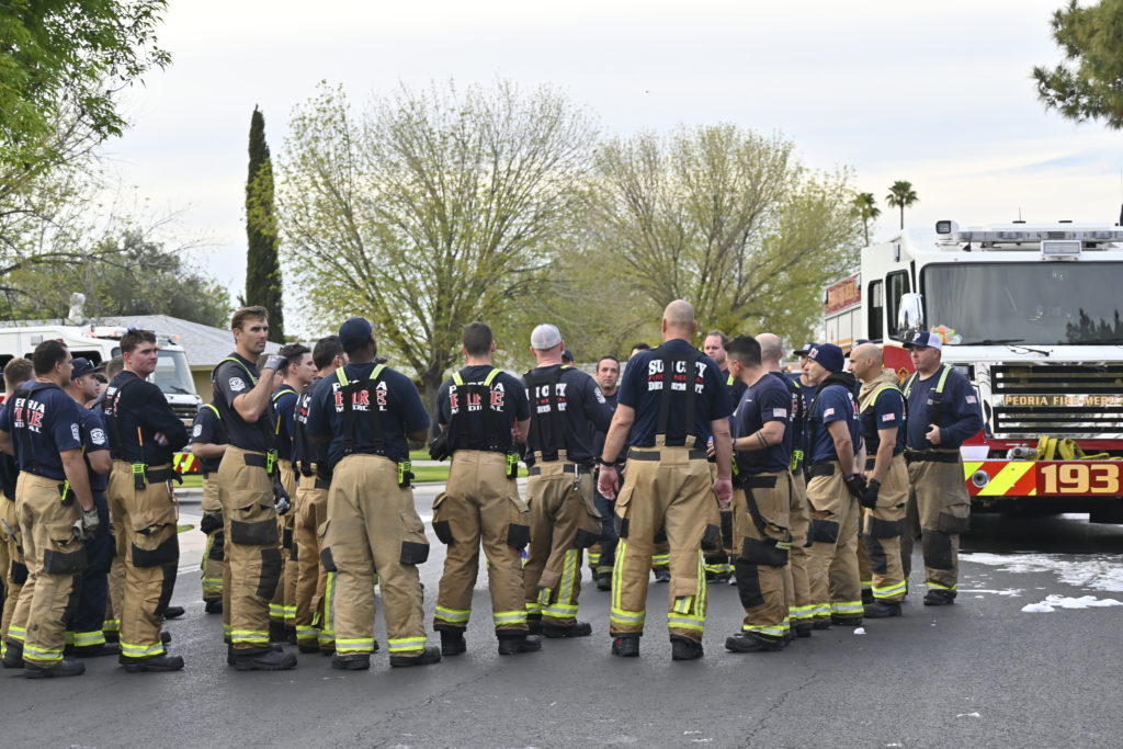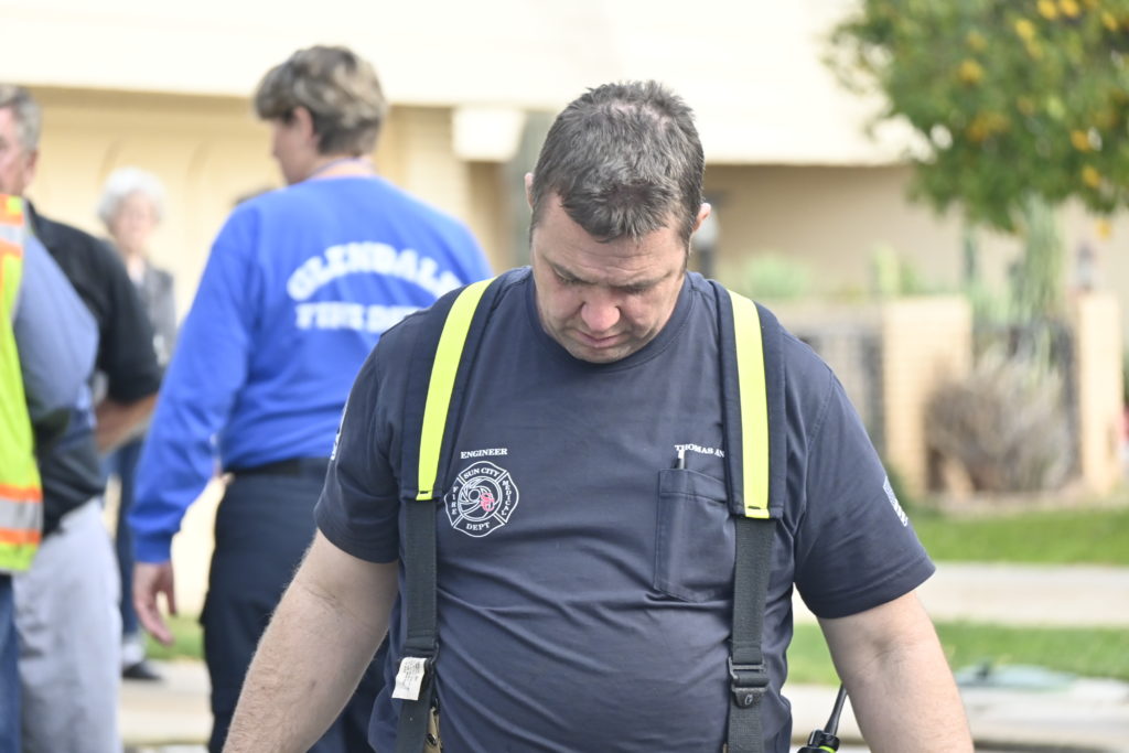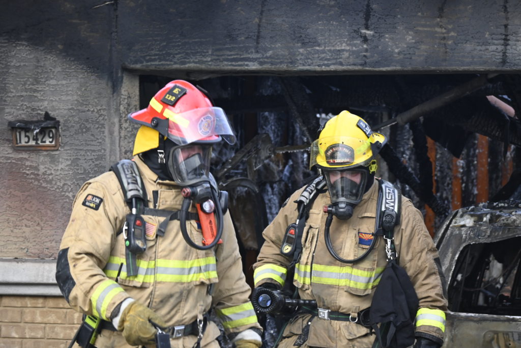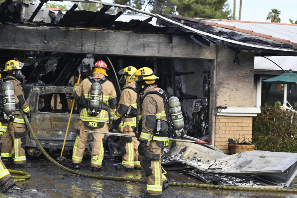 3/06/23 WF Suncity One Story Duplex Fire In One Garage With Heavy Ext Into The Unit The Attic And Thur The Roof Ext Into A Exp Garage Units When Defensive For A While The Units Did A Great Job Keeping It Out Of The Other Duplex Suncity & Peoria Glendale Working Cameo Dr Sandstone Dr