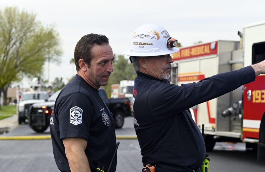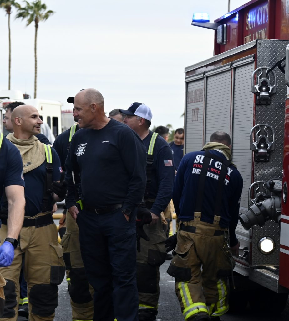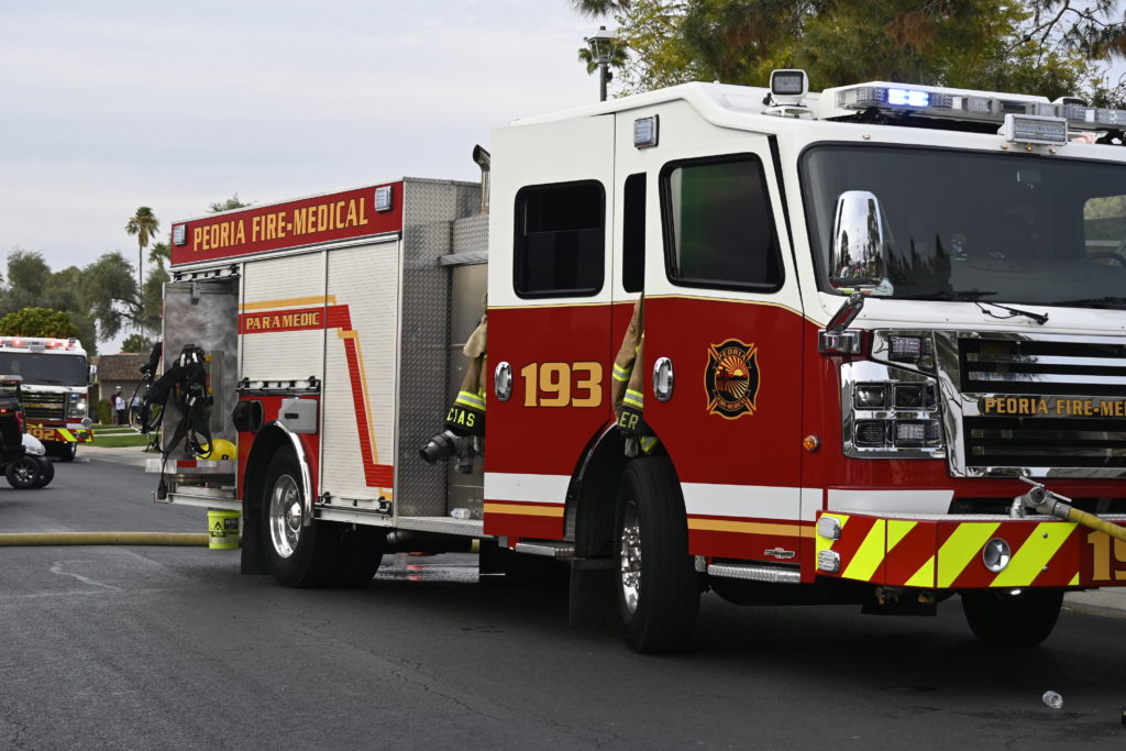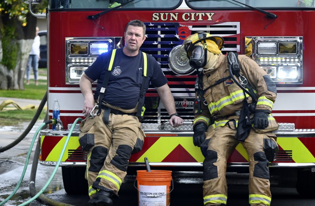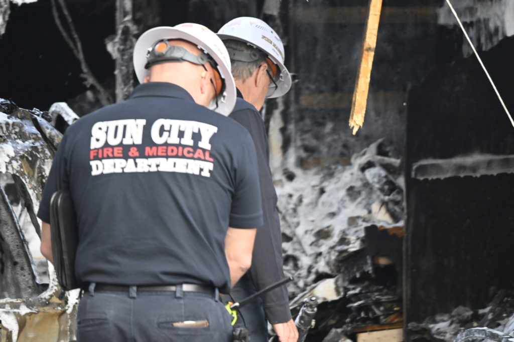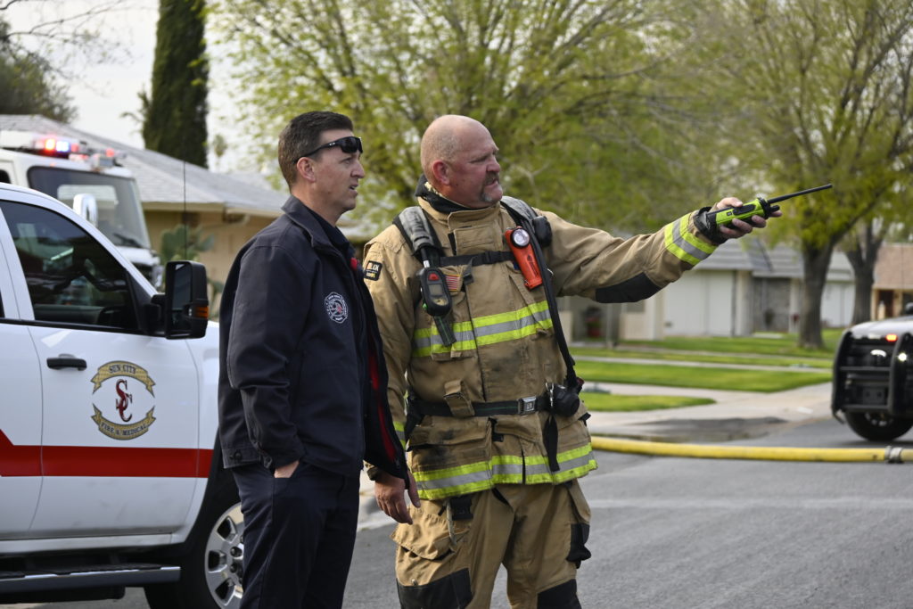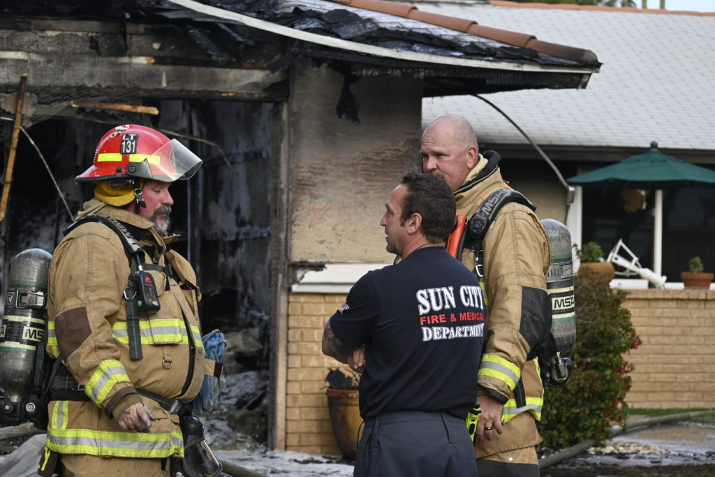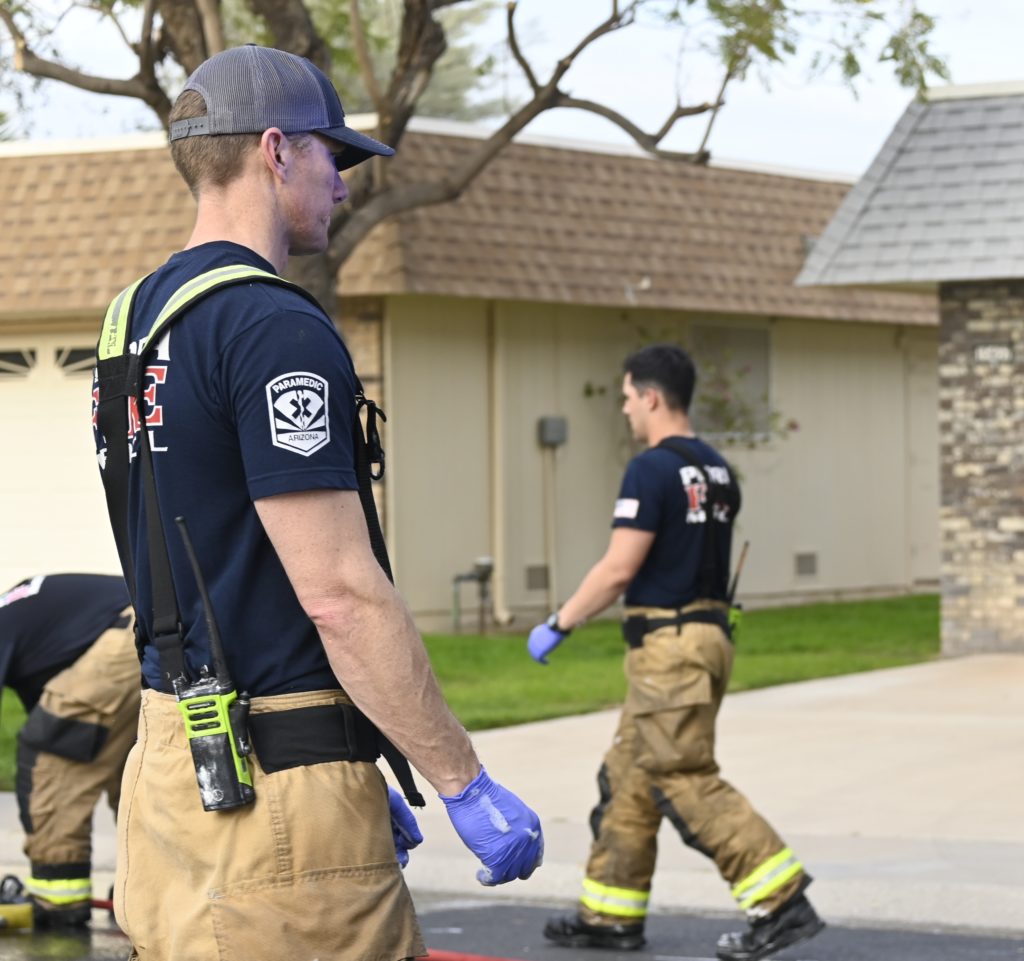 3/06/23 WF Suncity One Story Duplex Fire In One Garage With Heavy Ext Into The Unit The Attic And Thur The Roof Ext Into A Exp Garage Units When Defensive For A While The Units Did A Great Job Keeping It Out Of The Other Duplex Suncity & Peoria Glendale Working Cameo Dr Sandstone Dr